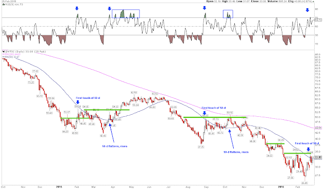 Crude has rallied back to its 50-dma. So far, the pattern looks constructive. Next, look for oil to consolidate near the 50-d (which then flattens/rises), push through the pivot (green line at $35) and stay overbought (top panel) as further signs that the trend may have changed for the better.