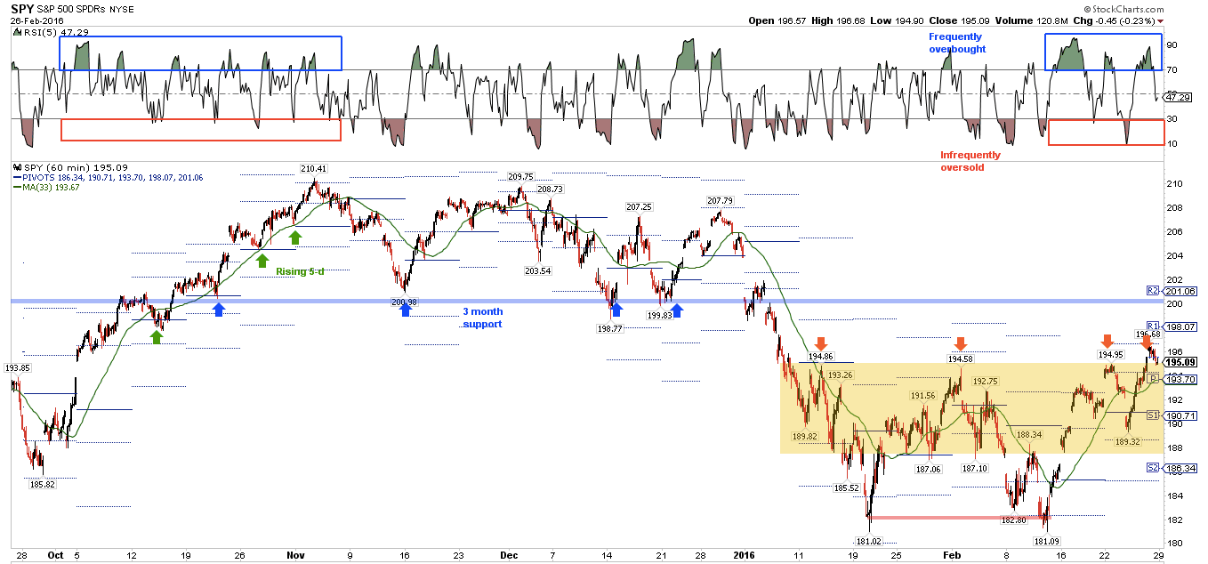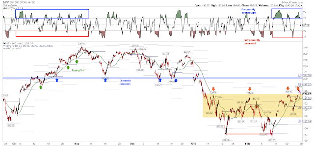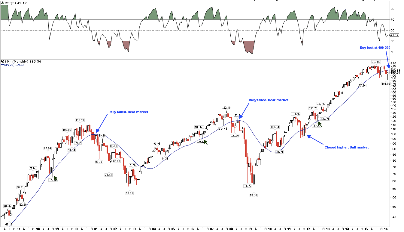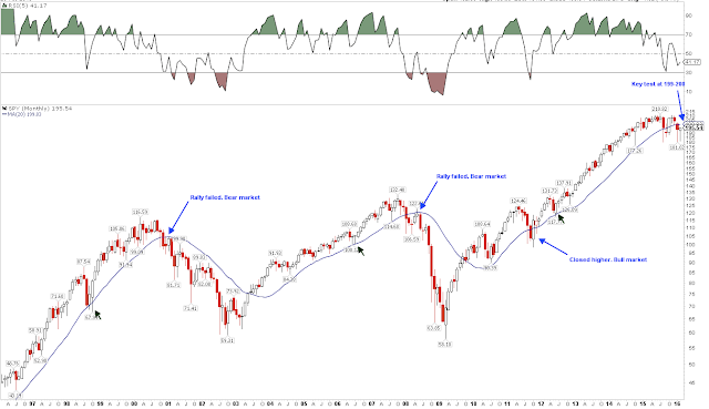 SPY is trading below its monthly 20-ma (blue line). In the past two bear markets, a rally that fails to close back above that 20-ma has led to a deep contraction. That makes 199-200 a critical watch out area for the current rally. If past is prologue, SPY should test that level in the next month: a close below will be bearish, a close above bullish.