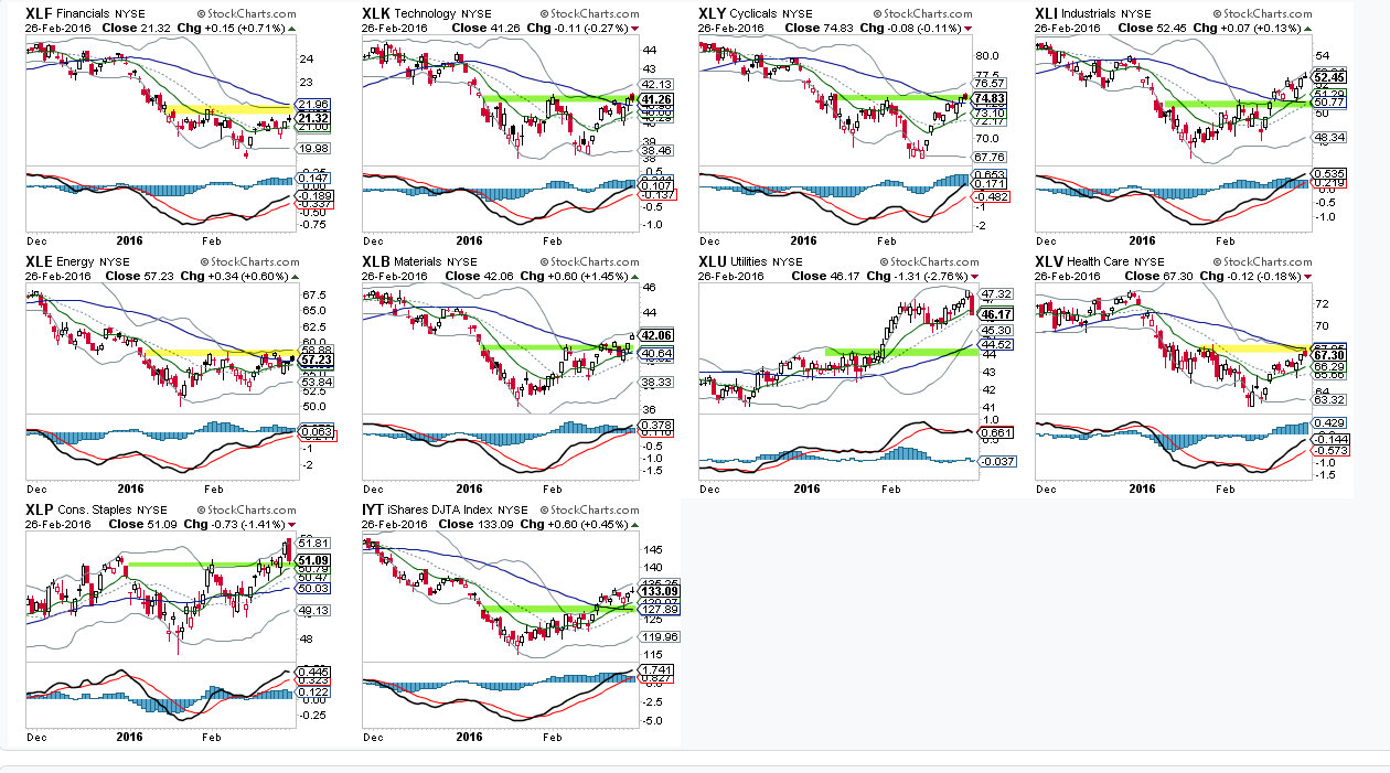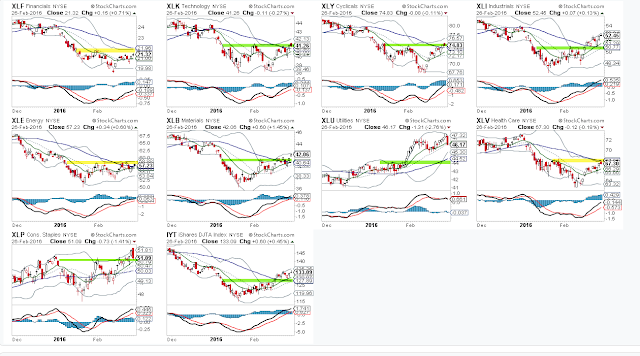 First, recall from last week that strong breadth most often leads to gains over the next multi-week period (post). To wit, Monday was another major accumulation day (90% up volume), the third one since the January low in equities. Moreover, most sectors have rallied past their early February highs and have regained their 50-dma. This is a positive. The laggards are financials, energy and healthcare.