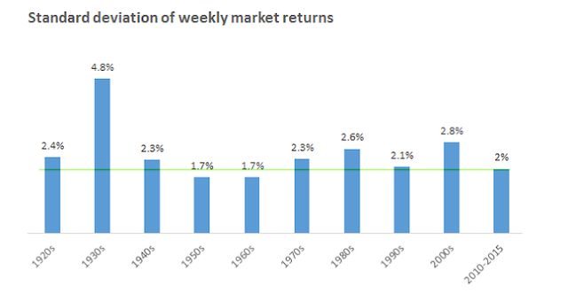 The second concern is that equities have become more volatile, and that this is indicative of instability that will inevitably lead to a collapse. A study by Morgan Housel (here) instead shows that daily, weekly, monthly and annual volatility over the past 6 years is in line with historical norms. Weekly volatility is actually at a 4 decade low.