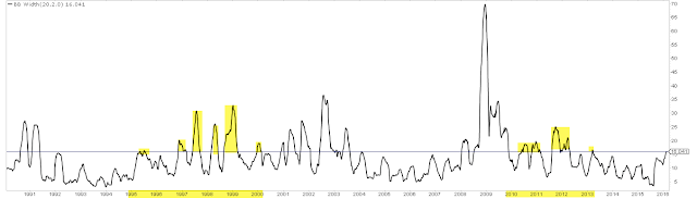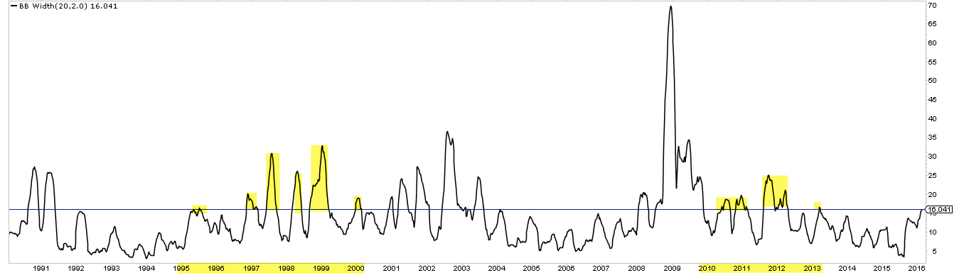 Volatility has increased in 2016 (as measured by the width of the 2 standard deviation Bollinger Bands for SPX), but it was higher during most of 2010-12 as well as during most of 1995-2000. Recent volatility probably seems extreme as it follows the relative (and unusual) calm during 2014-15.