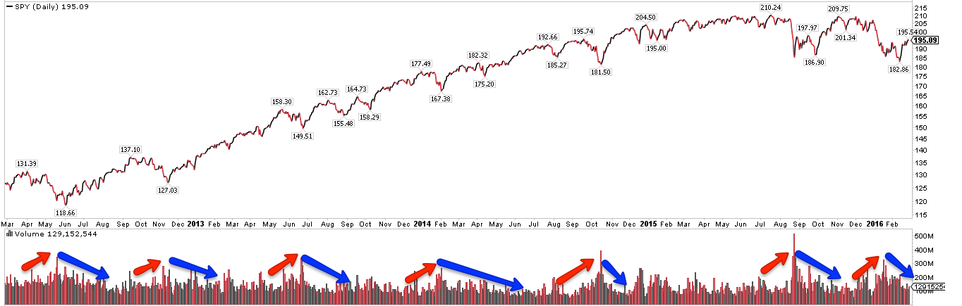 The first is that trading volumes are unusually low. They aren't. Equities typically sell off in a panic on high volume and then rise on lower volume as investors slowly get back in; hence the mantra "equities take the elevator down and the stairs back up." This week's volume averaged 120m shares/day in SPY, more than most weeks in 2013 and 2014. About 100m shares/day is normal; volume under 80m shares/day is anemic.