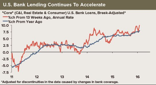 Among the many reasons to expect a bear market in equities, an imminent recession remains the weakest. In January, real personal consumption grew 2.9% yoy. Consumption continues to be healthy: today's revised 4Q15 GDP grew 1.9% yoy, with the consumption portion growing 2.6% yoy. The meme that GDP growth is being inflated by an inventory build is misleading: GDP net of inventories also grew 1.9% in 4Q15.