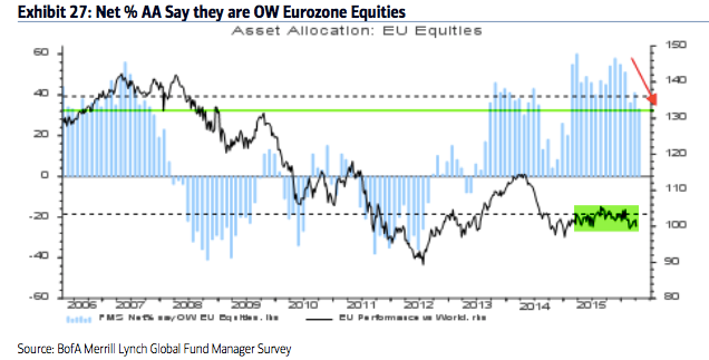 European equities: Eurozone exposure (+33% overweight) remains 0.7 standard deviations above the long term mean, making European equities at risk of continued underperformance.