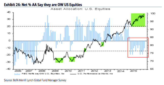 US equities: US exposure remains near an 8 year low (-10% underweight). Despite low exposure, US equities have outperformed the past 12 months. US equities have been under-owned and should continue to outperform those in Europe on a relative basis (see below).