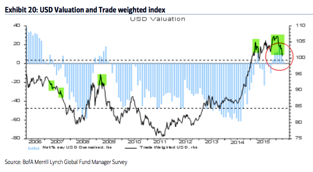 Global bonds: Fund managers are -38% underweight bonds, a big rise from -64% underweight in December, which was a 2-year low. Current allocations are near the highest since November 2012. Bonds outperformed in the 10 months before the current equity rally began in February. Note that bonds have historically started to underperform when allocations rise to -20% underweight.