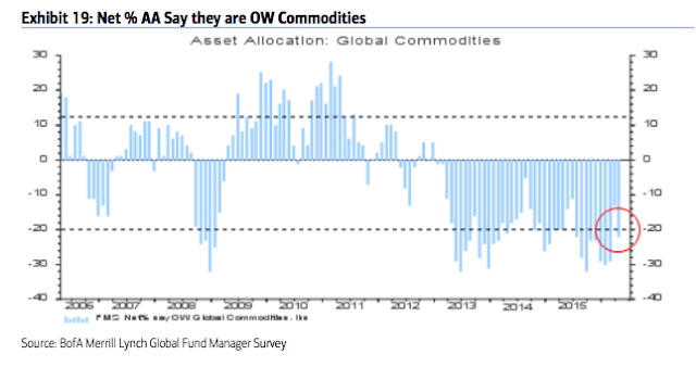 Emerging markets equities: In January, allocations to emerging markets fell to the second lowest in the survey's history (-33% underweight), an extreme comparable only to early-2014 from which the region began to strongly outperform for the next half a year. Allocations have since risen to -8% underweight, which is still 1.2 standard deviations below the long term mean. The region has outperformed the rest of the world so far 2016, and there remains further upside.