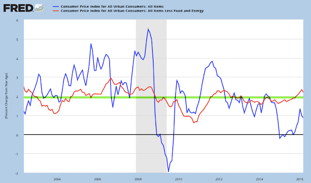 CPI (blue line) was 0.9% last month. The more important core CPI (excluding more volatile food and energy; red line) grew 2.2%, among the highest levels since 2008.