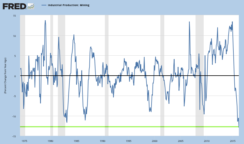Industrial production growth was -2.0% in March. The more important manufacturing component (excluding mining and oil/gas extraction; red line) grew 0.5%. It's a volatile series: manufacturing growth was lower at points in both 2013 and 2014 before rebounding strongly.