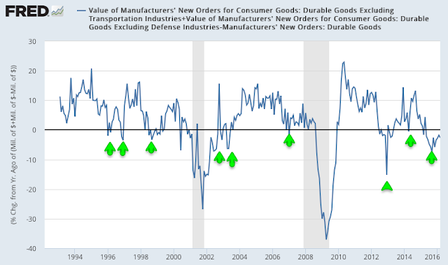 For this reason, it's better to look at the trend; in April, trend growth was 1.9% yoy. Annual growth continues to be close to the highest since the 1990s. Employment growth starting in 2014 has been better than at any time during the 2003-07 bull market. Ahead of a recession, employment growth will likely markedly fall (arrows). That isn't happening.