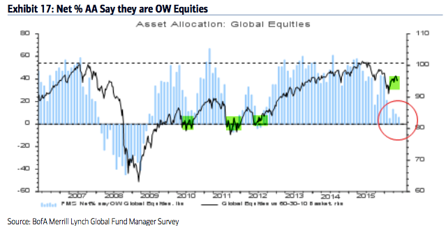 Similarly, the equity allocation of professional fund managers at the end of 2014 was equal to that at the market peak in 2007. That has since been completely unwound: equity allocations are now at the same levels as at market troughs in mid-2010, 2011 and 2012. Despite the 16% rally, cash levels are as high as in February and near all-time highs. US equity allocations are near an 8 year low. Read more in a post from this week here (from BAML).