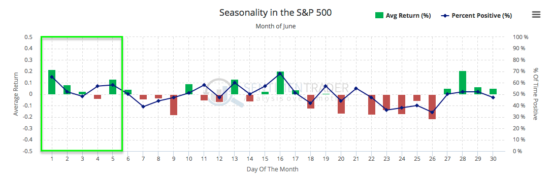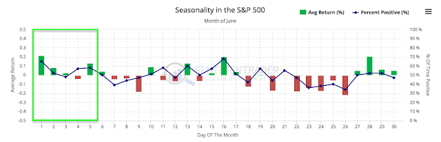 The end of May, starting on the Thursday before the Memorial Day weekend, typically has a positive seasonal bias (first chart) that carries through the first week of June (second chart). Seasonality is possible short-term tailwind (from Sentimentrader).