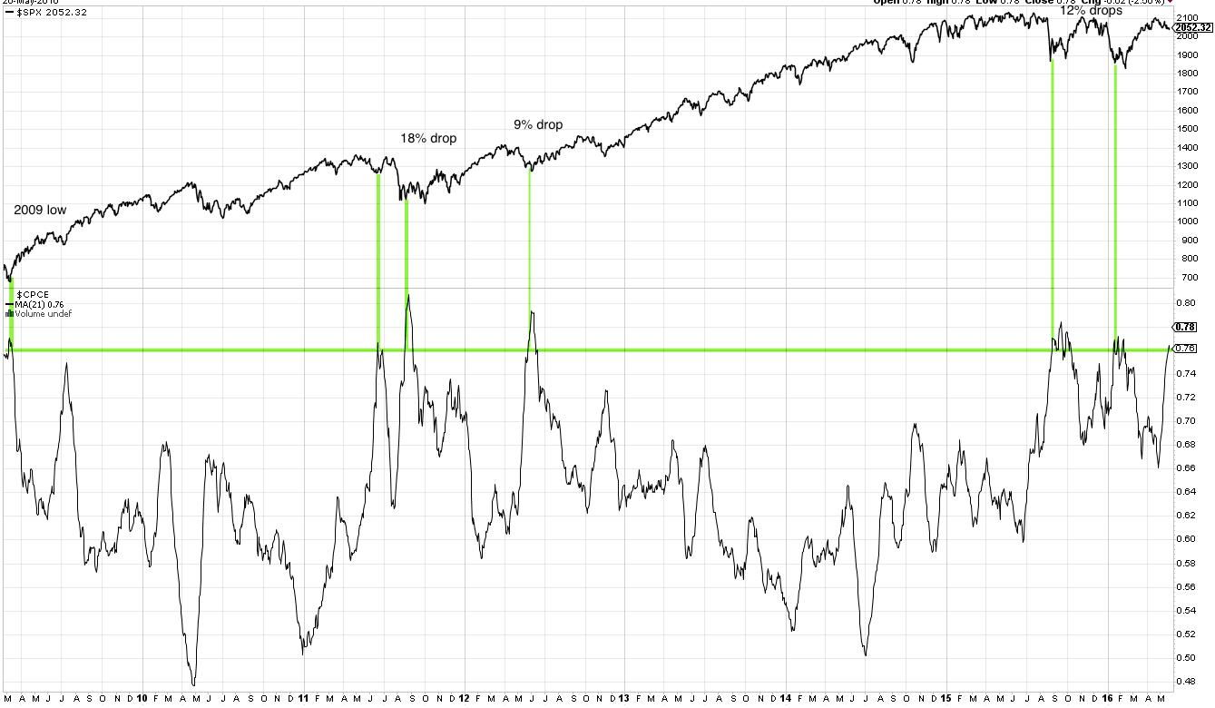 Finally, the equity-only put/call ratio over the past month is equivalent to that near the equity lows in 2009, 2011, 2012, 2015 and in February of this year. That's particularly impressive since equities fell by 10% or more in each of those cases, yet SPX is now barely 2% lower than at its April peak.