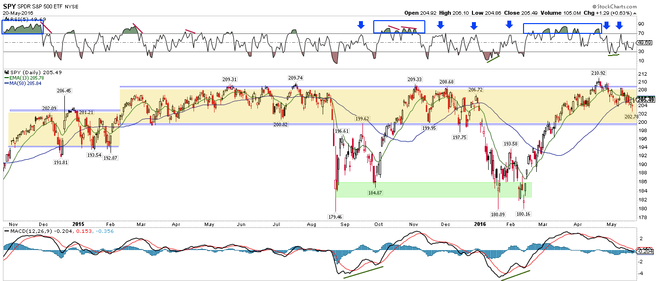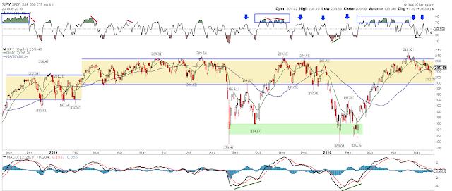 In the event, SPY visited its 50-dma the following week and then revisited that same level again this week. During this time, SPY has lost about 1% and remained within a tight 2% range for the past 3 weeks.