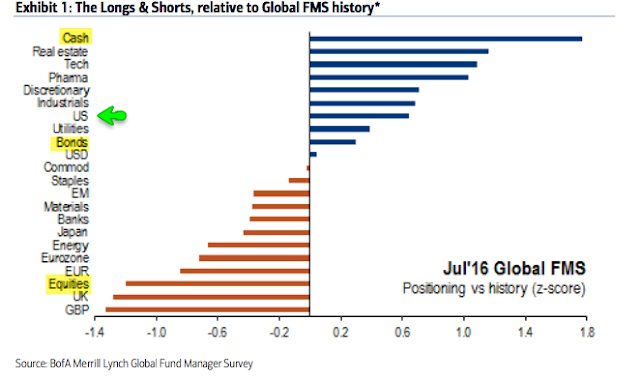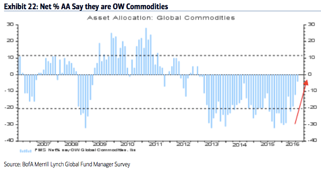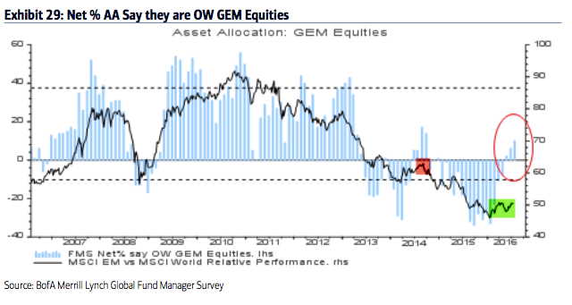 Allocations to US equities had been near 8-year lows over the past year, during which the US has outperformed most of the world. That has now changed: exposure to the US is at a 17-month high. There is room for exposure to move higher, but the tailwind for the US due to excessive bearish sentiment has mostly passed. That's also the case for emerging markets which have been the best performing equity region so far in 2016. European equity markets, which have been the consensus overweight and also the world's worst performing region, are now underweighted by fund managers for the first time in 3 years.