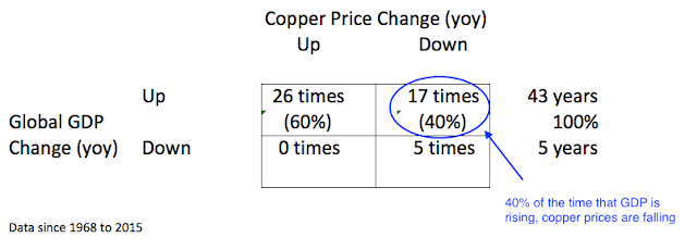 Consider this. The price of copper fell by half during the 1990s. During this time, global GDP grew 50%. Nobody looking at the relationship between these two in real time was impressed by copper's PhD.