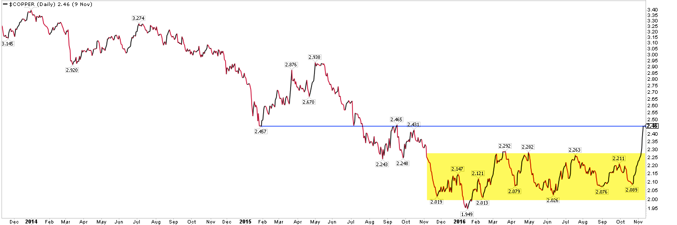 Copper prices are surging. The metal's price is up over 20% in 2016. Current prices are the highest in about 18 months. Enlarge any image by clicking on it.