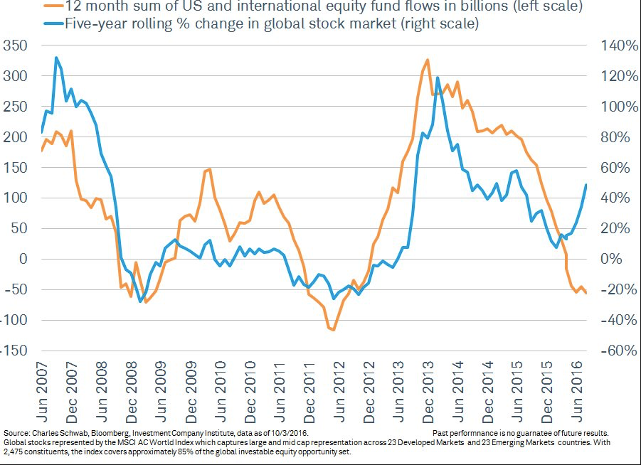 Schwab looks at the same equity fund flow data but over a trailing 12 month basis (orange line). Again, the sample size is small but their view is that this correlates well with the next 5 year change in equity prices (blue line).