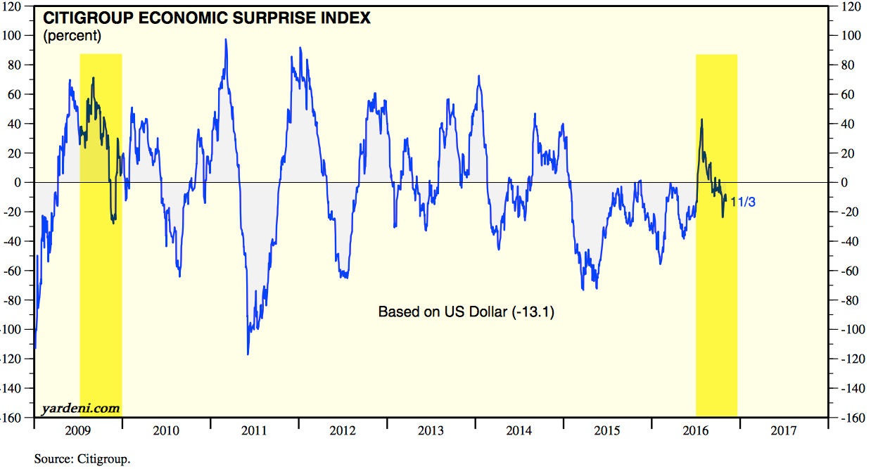 Real (inflation adjusted) GDP growth through 3Q16 was 1.5% yoy. 3Q growth was near the bottom of the post-recession range (1.0-3.0%) and lower than the 2.5-5% common during prior expansionary periods since 1980.