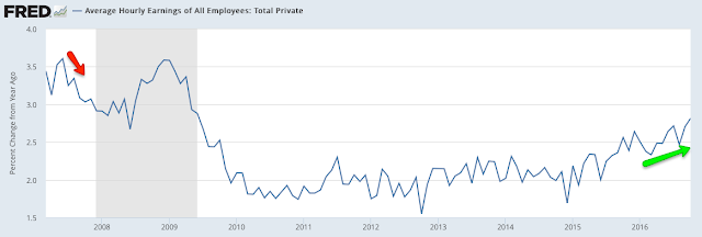 Similarly, the "real personal consumption expenditures" component of GDP (defined), the component which accounts for about 70% of GDP, grew at 2.6% yoy in 3Q16. The last eight quarters have seen the highest persistent growth rate since 2006. This is approaching the 3-5% that was common in prior expansionary periods after 1980.