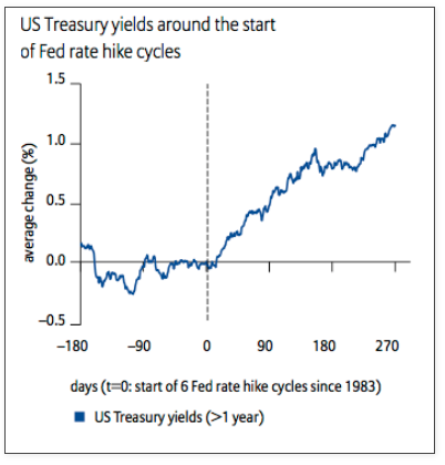 That was unexpected. Yields had risen from 1.9% in October and from 1.6% in January 2015. In the six prior rate hike cycles since 1983, yields had continued to rise after the FOMC decision (data from Allianz).