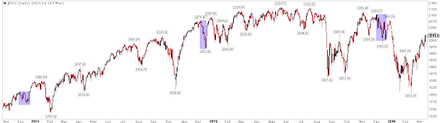 Moreover, investors are leaning towards excessive short-term bullishness (longer term bullishness, as measured by equity fund flows and fund manager cash, are supportive of further gains in equities; read further here and here). The trailing 1-month equity-only put/call ratio is now at a level where every rally since August 2014 has stalled.