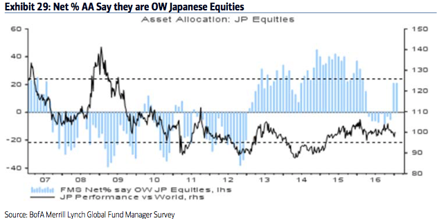 Japanese equities: Allocations to Japan had been falling in 2016 after excessive bullishness in 2015. Allocations fell to -8% underweight in September, the lowest since December 2012. Now, allocations have jumped back to +21% overweight. This is 0.6 standard deviations above its long term mean. Bullish sentiment is close to becoming a headwind (dashed line)
