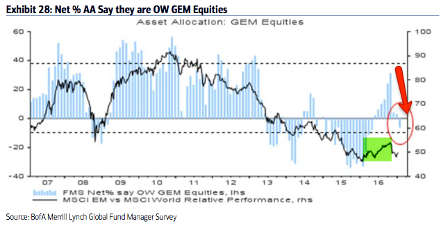 Among the various ways of measuring investor sentiment, the BAML survey of global fund managers is one of the better as the results reflect how managers are allocated in various asset classes. These managers oversee a combined $500b in assets.