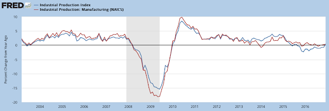 Industrial production growth grew 0.5% in December. The more important manufacturing component (excluding mining and oil/gas extraction; red line) rose 0.4% yoy. This is a volatile series: manufacturing growth was lower at points in both 2013 and 2014 before rebounding strongly.