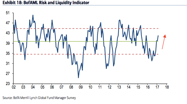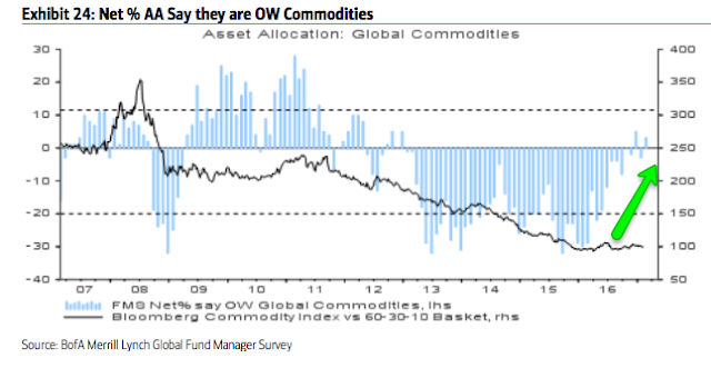 Commodities: Allocations to commodities are now near a 4-year high (+3% overweight). This 0.4 standard deviations above its long term mean. In comparison, a year ago in February 2016, allocations were near one of the lowest levels in the survey's history (-29% underweight). The improvement in commodity allocations goes together with increased macro optimism.