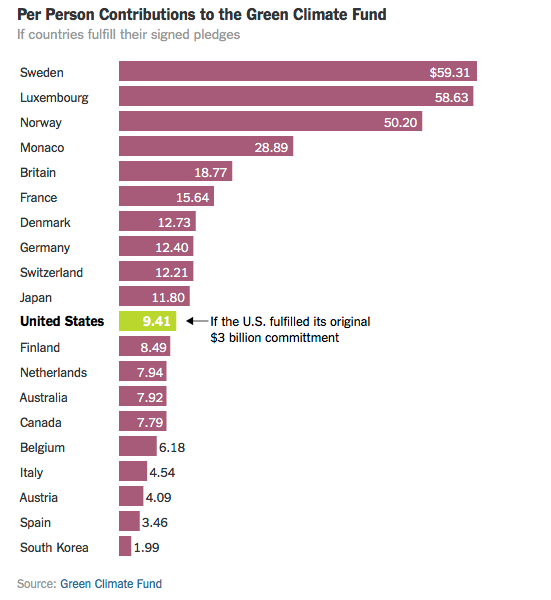 The EU has committed the most to the Fund: $4.7 billion. The US has pledged $3 billion, of which it has paid $1 billion. This amounts to $9 per person if the US fulfills its pledge, an insignificant amount of money. On a per capita basis, the US pledge ranks 11th (more here and here).