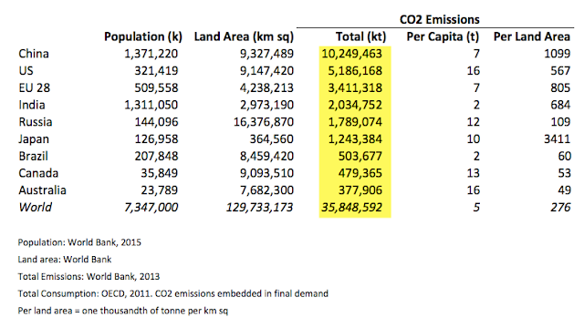 So it is more accurate to look at CO2 emissions per person. On this basis, the US and Australia are the largest source of emissions, followed by Canada and Russia. The EU and China are less than half of those countries while India is 1/8th.