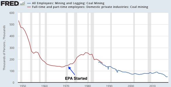 The poster child for job killing environmental regulations is coal mining, but coal employment fell 75% in the 20 years before the Environmental Protection Agency (EPA) was founded in 1970. Over the past 30 years, coal employment has fallen by another 1/3 yet coal production was at an all-time high as recently as 2008. New technology and lower cost sources of power (like natural gas and, increasingly, renewables) killed these jobs.