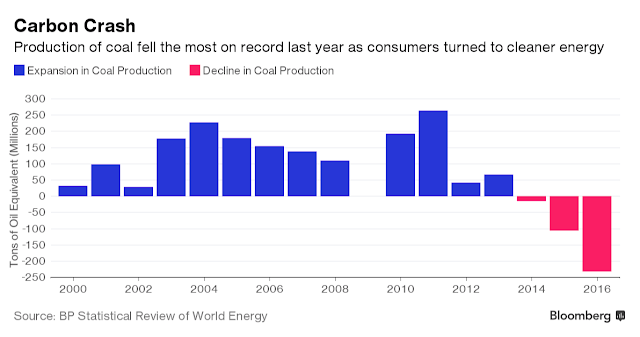 It would be more accurate to say that environmental standards contributed to technological innovation and the advent of new industries and jobs. Consider the following: worldwide, renewable energy generation has doubled in just 4 years (first chart). Meanwhile, the demand for coal fell by the most on record in 2016 as even China reduced demand (from Bloomberg).